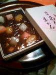 求肥と栗と寒天のあんみつを羊羹で固めた見た目で、甘いんじゃと思われるが、なんのその甘くない。さっぱりしている。結構量がはいる。